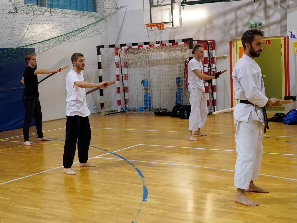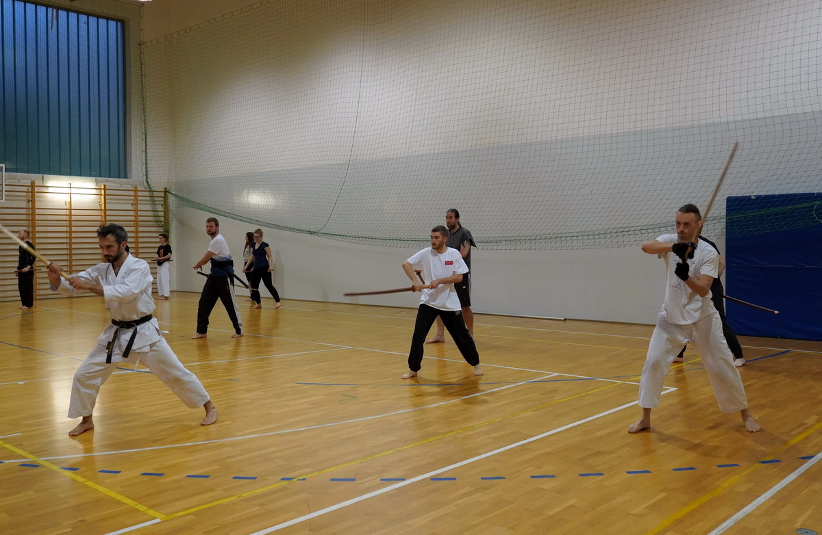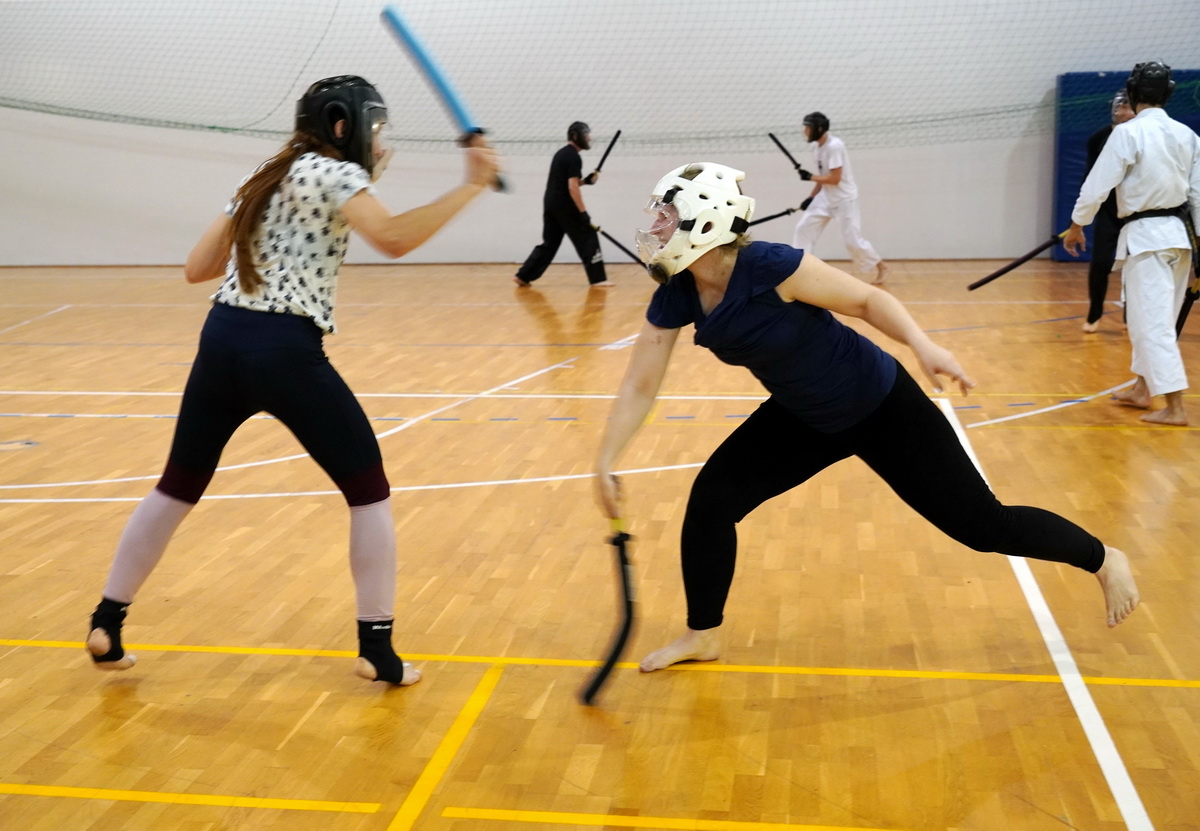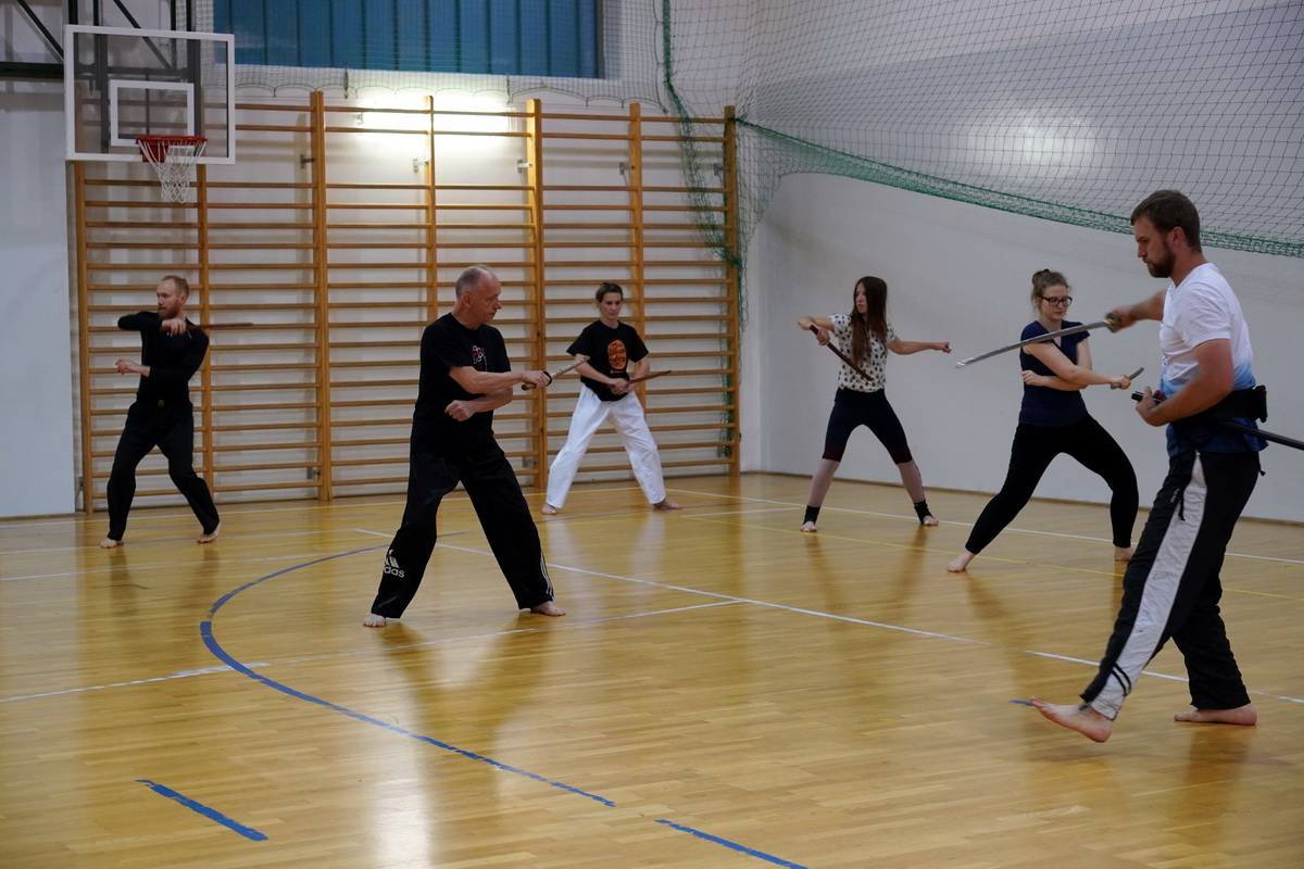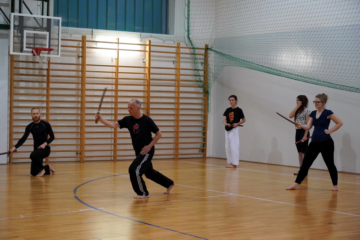 Fot. Shihan Michal Piotrkowicz 5. dan chanbara uczył technik formalnych długim mieczem, a sensei Krzysztof Jerzykowski 3. dan (w głębi hali) technik krótkiego miecza – kodachi.