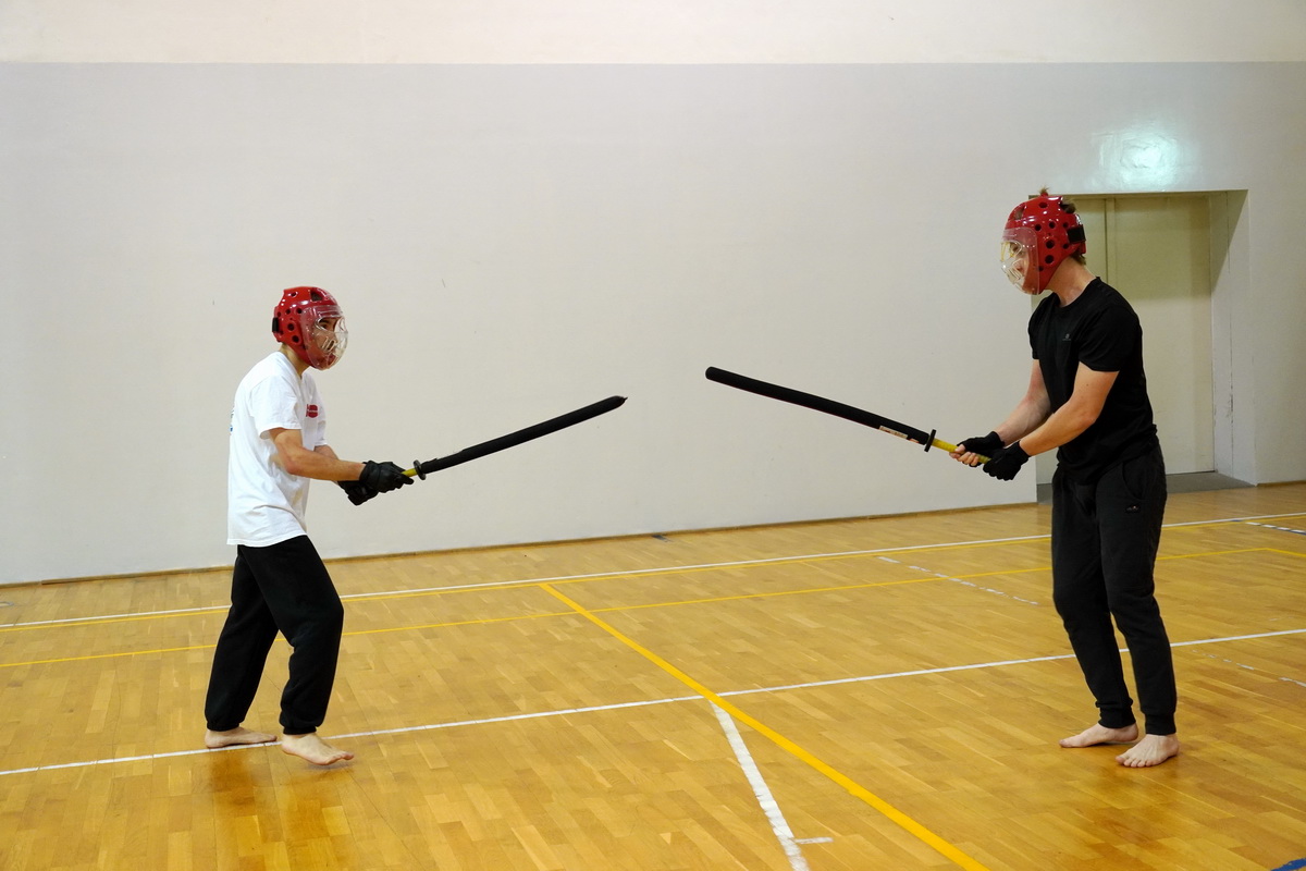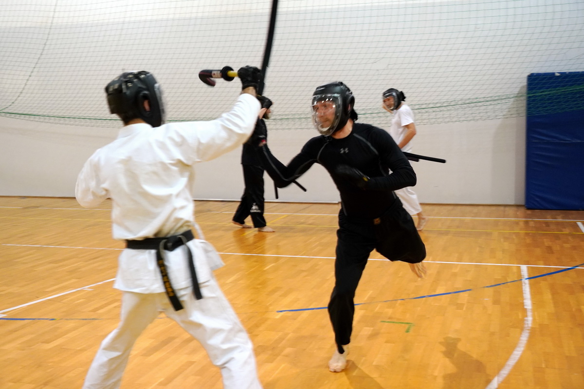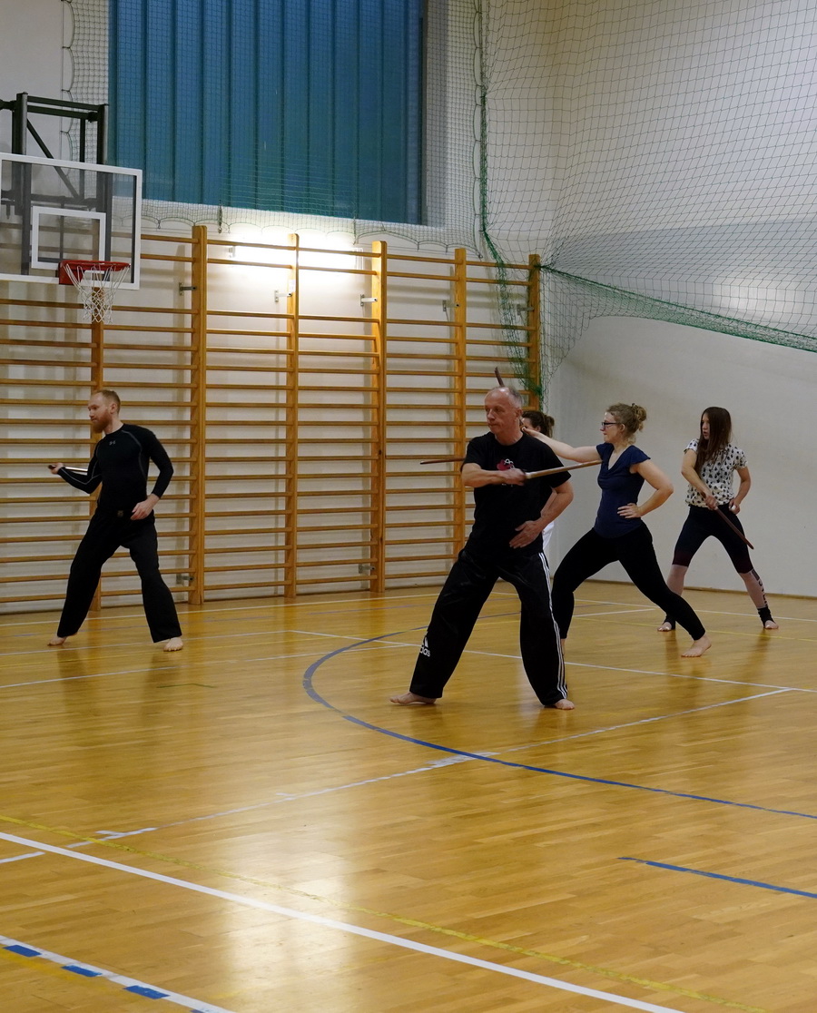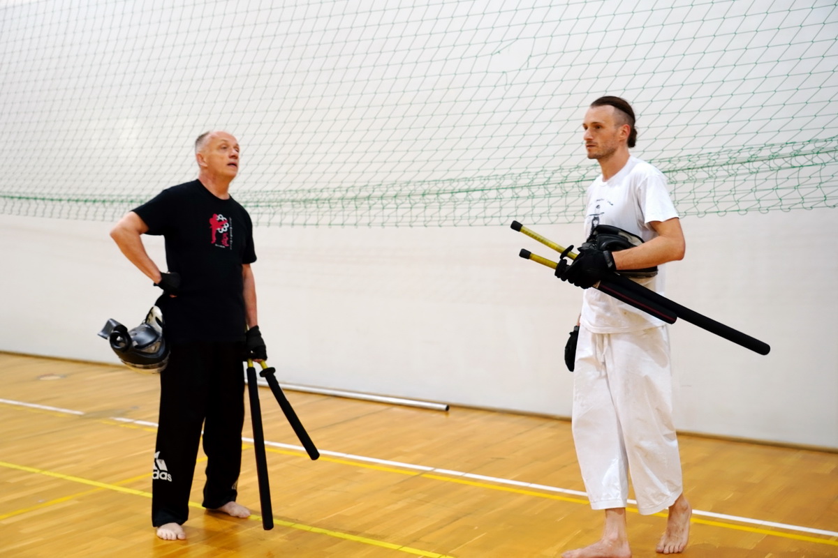 Fot. Shihan Michal Piotrkowicz 5. dan chanbara uczył technik formalnych długim mieczem, a sensei Krzysztof Jerzykowski 3. dan (w głębi hali) technik krótkiego miecza – kodachi.