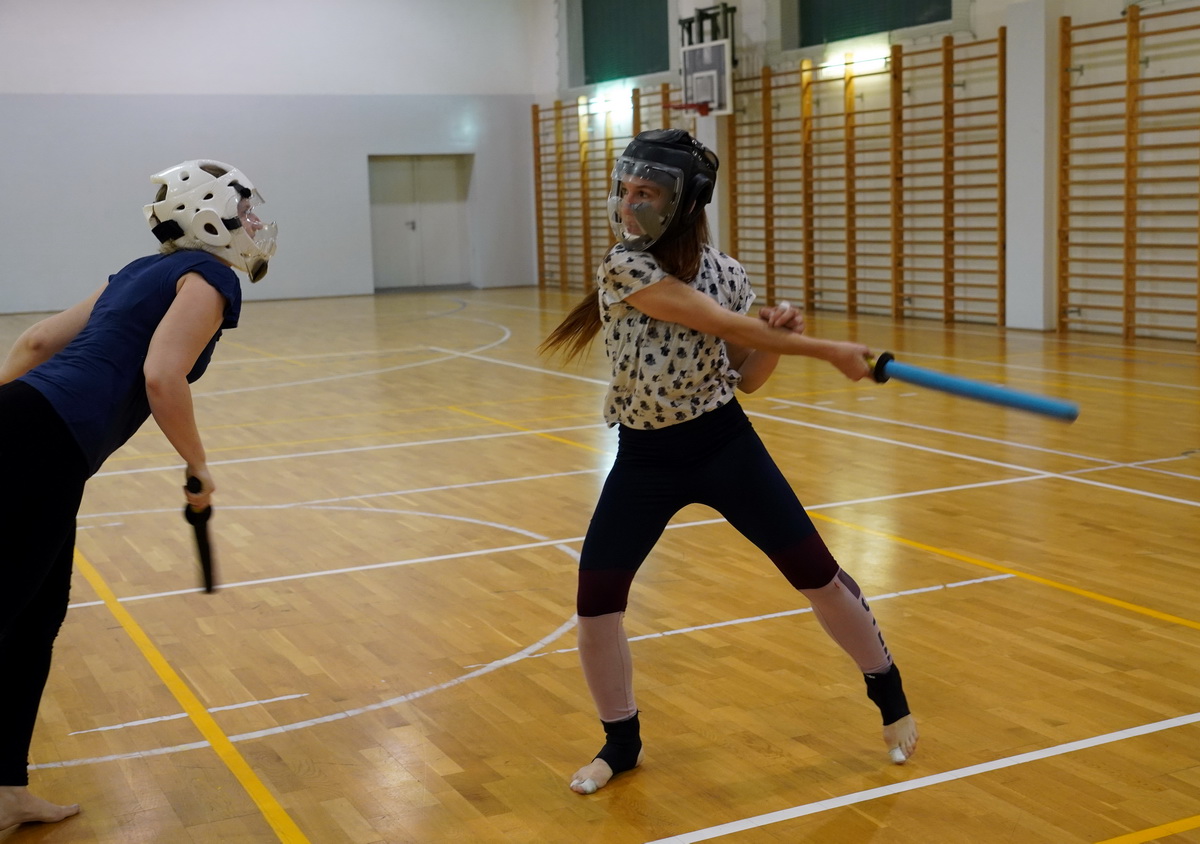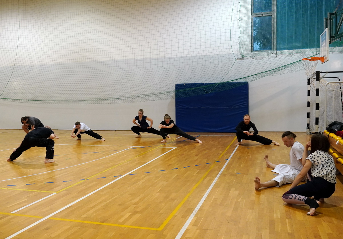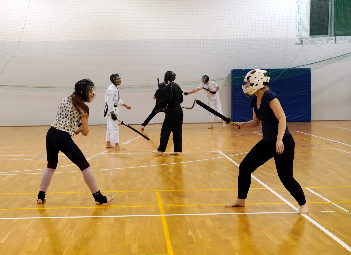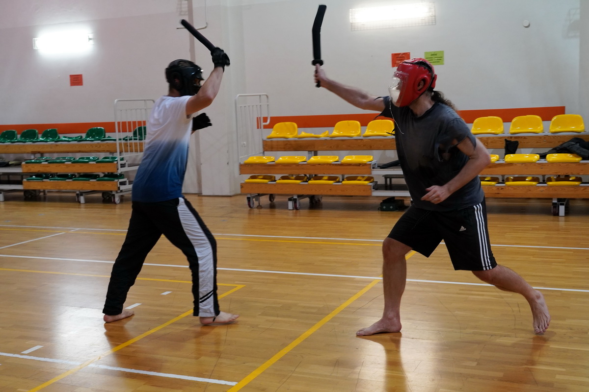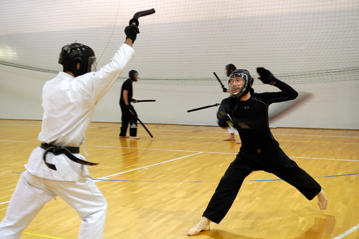 Fot. Shihan Michal Piotrkowicz 5. dan chanbara uczył technik formalnych długim mieczem, a sensei Krzysztof Jerzykowski 3. dan (w głębi hali) technik krótkiego miecza – kodachi.