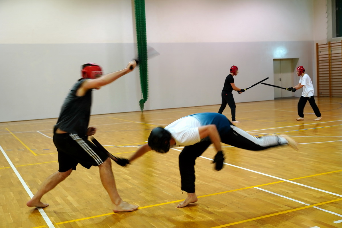 Fot. Na pierwszym planie pojedynek Remka i Marcina krótkimi mieczami kodachi, w tle długie miecze – chokeny. Marcin wykonuje dynamiczny wypad ze skutecznym atakiem na nogę Remka.